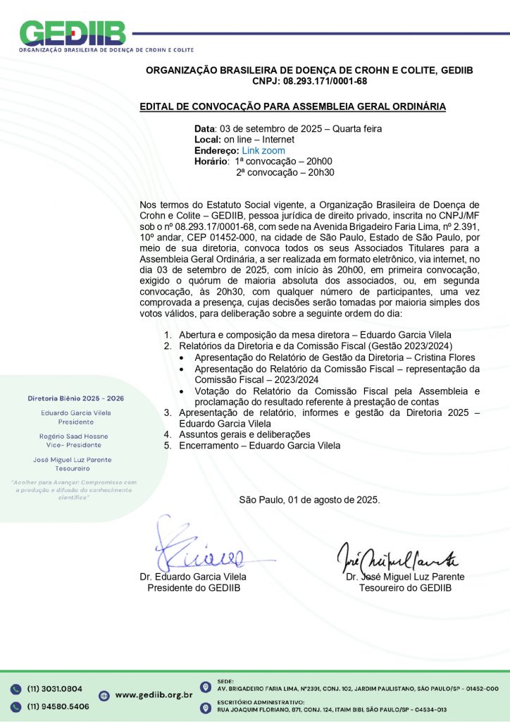 Nos termos do Estatuto Social vigente, a Organização Brasileira de Doença de Crohn e Colite – GEDIIB, pessoa jurídica de direito privado, inscrita no CNPJ/MF sob o nº 08.293.17/0001-68, com sede na Avenida Brigadeiro Faria Lima, nº 2.391, 10º andar, CEP 01452-000, na cidade de São Paulo, Estado de São Paulo, por meio de sua diretoria, convoca todos os seus Associados Titulares para a Assembleia Geral Ordinária, a ser realizada em formato eletrônico, via internet, no dia 03 de setembro de 2025, com início às 20h00, em primeira convocação, exigido o quórum de maioria absoluta dos associados, ou, em segunda convocação, às 20h30, com qualquer número de participantes, uma vez comprovada a presença, cujas decisões serão tomadas por maioria simples dos votos válidos.