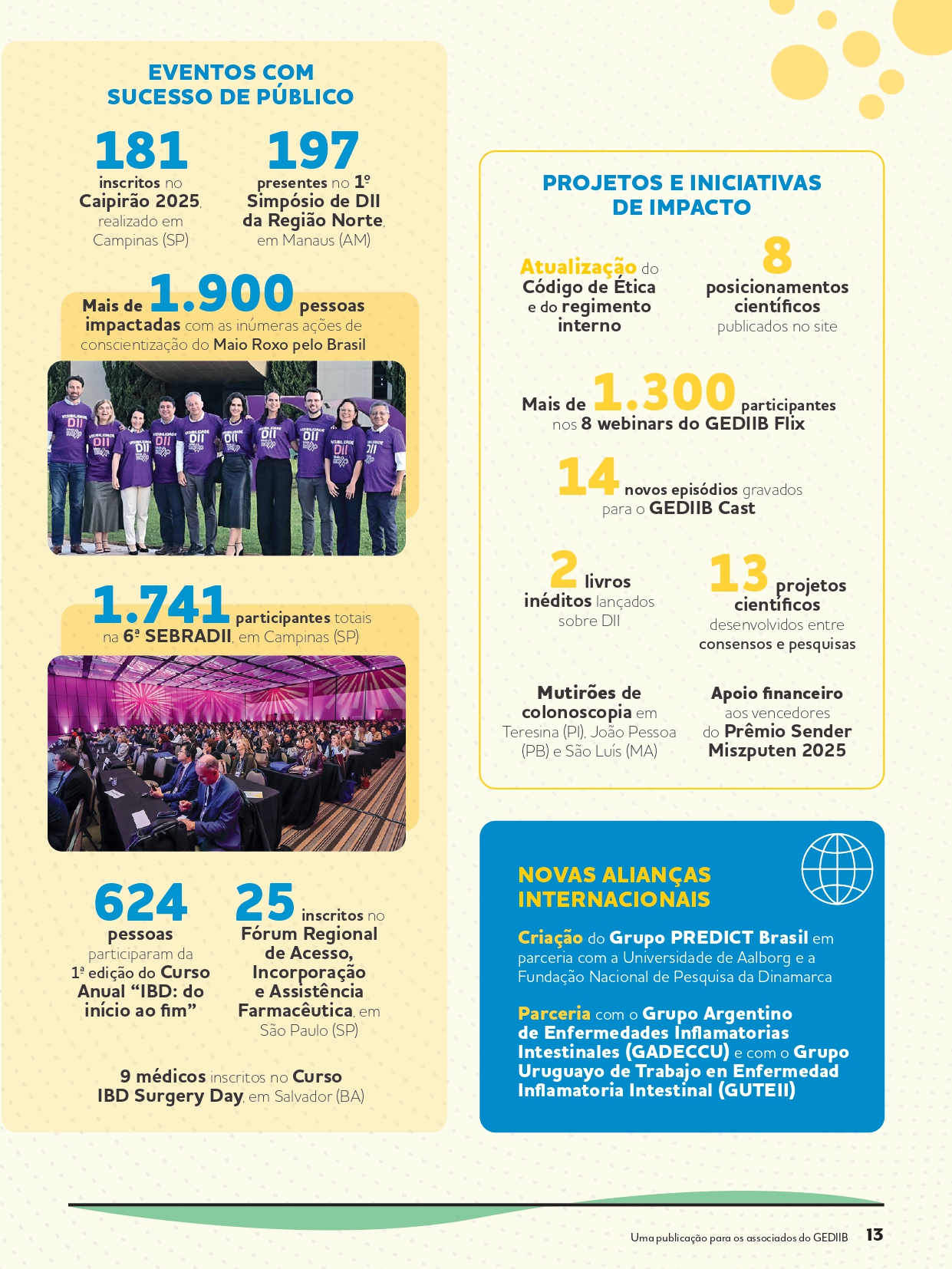 Outros eventos de destaque incluíram o Caipirão 2025, com 181 inscritos, e o Simpósio Norte em Manaus, que reuniu 197 profissionais. A campanha Maio Roxo impactou mais de 1.900 pessoas, aumentando a conscientização sobre as DIIs. O Fórum Regional em São Paulo contou com a participação de 25 especialistas, e 9 médicos participaram do IBD Surgery Day em Salvador, promovendo a troca de experiências e a atualização profissional.